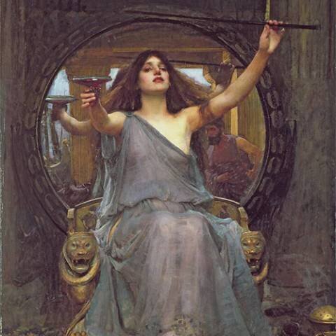 Circé est sans doute LE symbole de la sorcière – femme fatale dangereuse. Dans la mythologie grecque, la magicienne vit seule sur son île quand Ulysse et ses compagnons y accostent. Avec un philtre, elle les aurait alors transformés (à l’exception d’Ulysse) en cochons. Après un an de détention, où Ulysse devient son amant et avec qui elle aura un enfant, elle leur rend forme humaine et ils reprennent la mer.