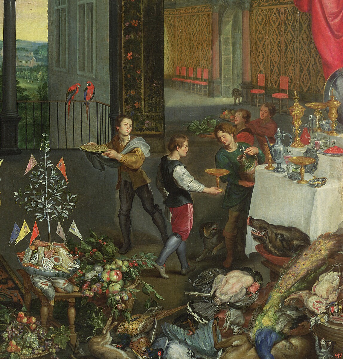Mots-clés : Job, peinture, aliment, animal, banquet, boisson, gibier, gouter, goût, jeu, joueur, nourriture, peinture, repas, sanglier, servante, serviteur, Travail, vaisselle, viande, vin