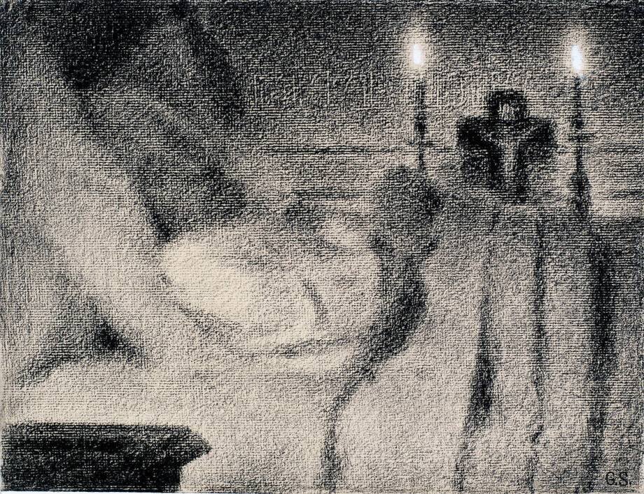 Mots-clés : 19e siècle, Impressionnisme, Pointillisme, bougie, chambre, couché, femme, intérieur, lit, maladie, mort