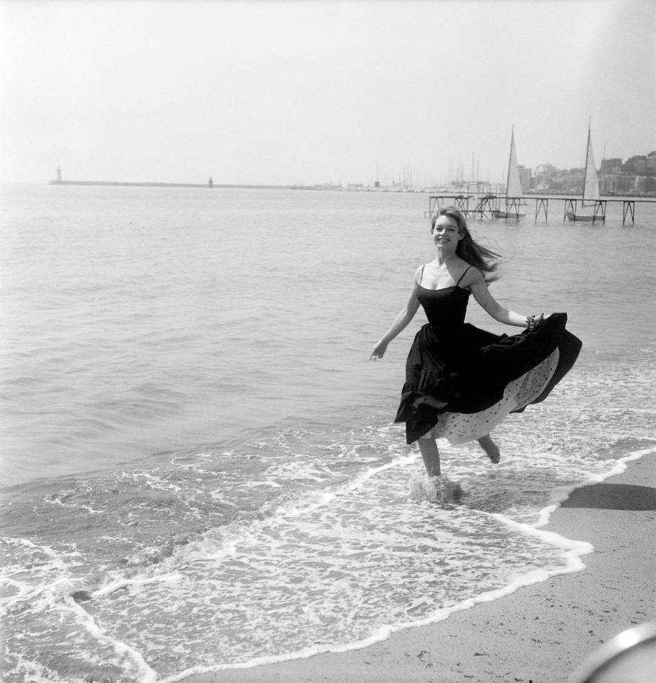 Mots-clés : Brigitte Bardot, actrice, comédienne, blonde, femme, mer, noir et blanc, robe