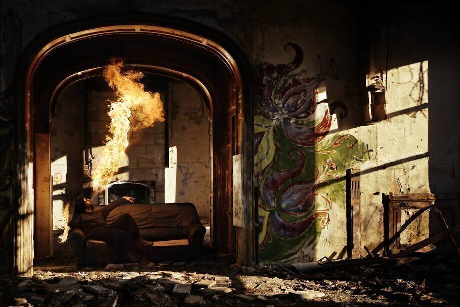 Mots-clés : bâtiment, feu, homme, intérieur, mur, ruines, en ruines