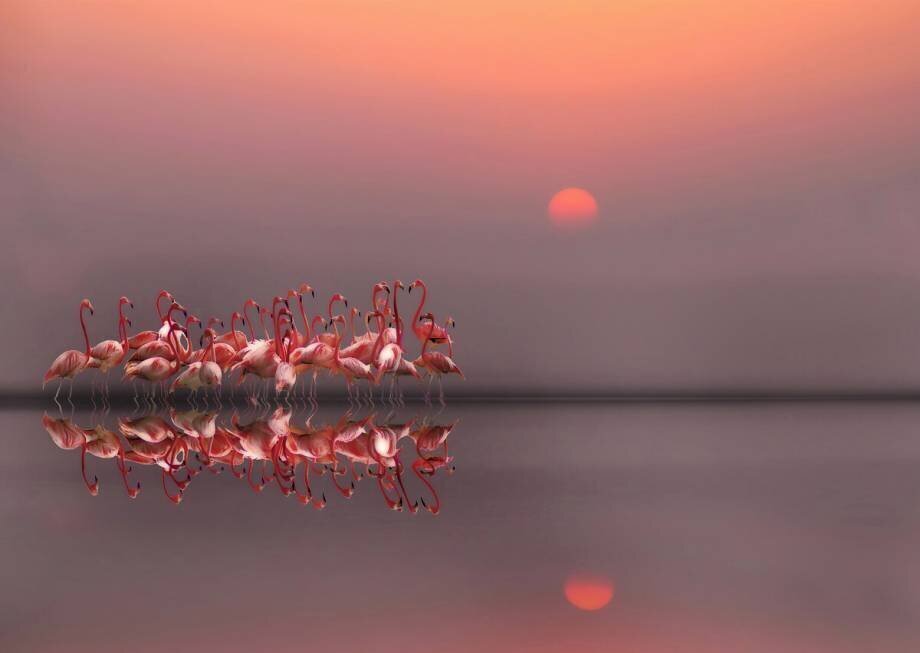 Mots-clés : ciel, effet miroir, flamant rose, horizon, nature, photographie, reflet, rose, soleil, violet, violette