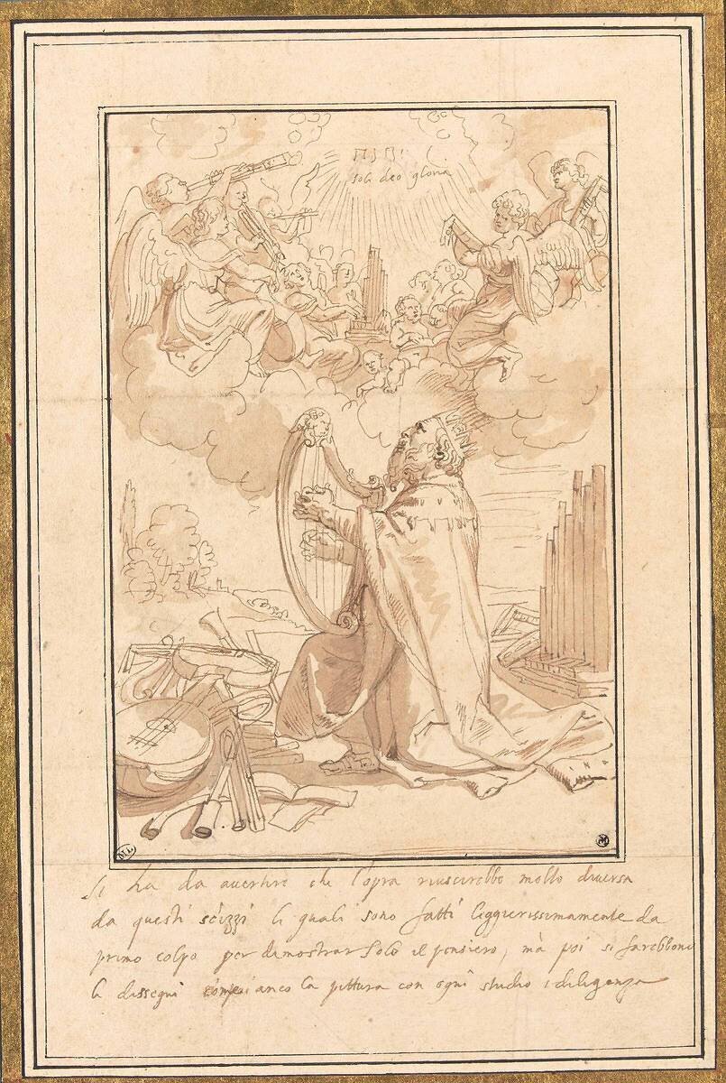 Mots-clés : 17e siècle, Baroque, David, angelot, couronne, effet de lumière, harpe, instrument de musique, musicien, musicienne
