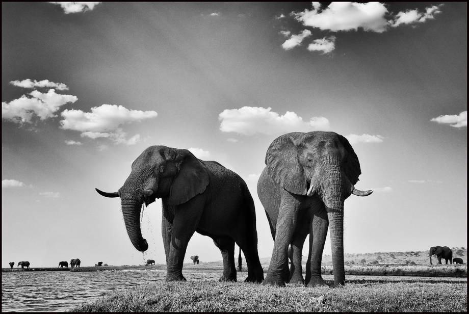 Mots-clés : défense, effet de lumière, noir et blanc, nuage, rivière, soleil, éléphant