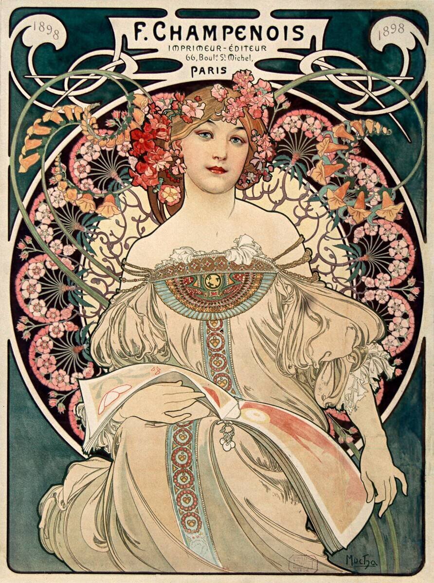 Alphonse Mucha, artiste slave, produira une certain nombre de ces panneaux décoratifs chez F. Champenois, son éditeur exclusif. A partir de 1896, l'artiste croule sous les commandes publicitaires et ne tarde pas à devenir l'affichiste le plus demandé de Paris et le héraut de l'Art Nouveau. Il emploie dans ces affiches une sorte de "formule" qu'il décline au gré de ses envies. En 1897, il réalise F. Champenois imprimeur-éditeur, une affiche mettant en scène une jeune femme, une "femme Art Nouveau", à la fois sensuelle et gaie. Drapée dans une robe fluide, proche d'un déshabillé de soie, elle est enserrée dans un décor floral foisonnant très stylisé.