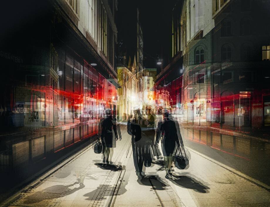 Mots-clés : cadre urbain, effet de lumière, flou, nuit, passant, piéton, photographie, rue