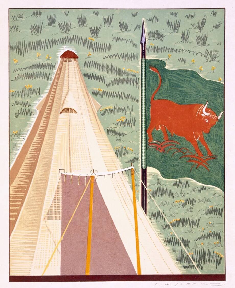 Mots-clés : bannière, campement, drapeau, taureau, tente, tipi, étendard