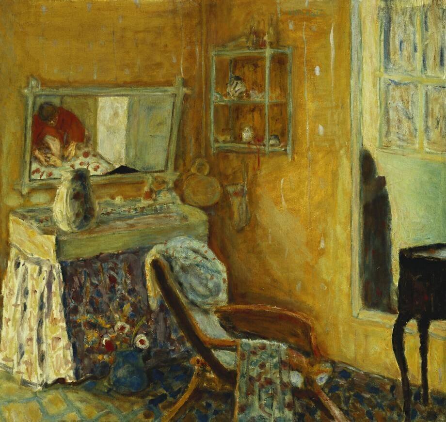 Mots-clés : 20e siècle, Flore, Nabi, banquette, bâtiment, chaise, couleur, drapé, dégradé, fleur, huile, immeuble, building, gratte-ciel, intérieur, jaune, jour, maison, meuble, miroir, mobilier, motif, mur, nature, pièce d'habitation, plante, pétrole, reflet, rideau, rouge, réflexion, salon, Siège, table, vase