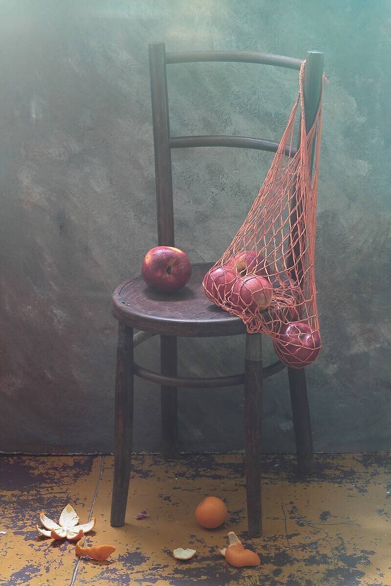 Sujets: Nature morteMots-clés: Photo contemporaine plasticienne, chaise, les gémeaux, nature morte, photographie, pomme, sac, signe du zodiaque, écorce(Ref : 197851) © UstinaGreen / 1X