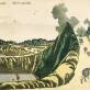 Hokusai délaisse ses habituelles estampes et vues du Mont-Fuji pour se consacrer à Kudan, à l’époque du Japon d’Edo. Cette œuvre représente un chemin parcourant le bassin d’Ushigafuchi, typiquement japonais, bercé par une atmosphère de quiétude apparente. Hokusai change complètement de son registre habituel, jouant sur les perspectives dans son œuvre, bien loin des idéaux artistiques japonais, pourtant de rigueur à la période d’Edo, gouvernée par l’introduction de coutumes strictes favorisant la stabilité. L’artiste dévoile ainsi des personnages, arpentant les routes de Kudan, à la taille parfaitement conforme au décor qu’ils habitent, apportant une impression de multiculturalisme à l’estampe. Le jeu des ombres, mais aussi le rendu réaliste des nuages, dévoile une rupture tangible avec les arts asiatiques, Hokusai prenant même le parti d’intégrer une bordure décorative, imitant un cadre de tableaux occidentaux. Kudan est grandement inspiré des arts picturaux européens, auxquels il s’initie auprès de Shiba Kônan, ayant fréquenté des marchands néerlandais, lui faisant part de leurs techniques. Ainsi, Hokusai pousse cette nouvelle lubie en inscrivant sa signature et le titre en hiragana, et à l’horizontale, telle l’écriture occidentale.