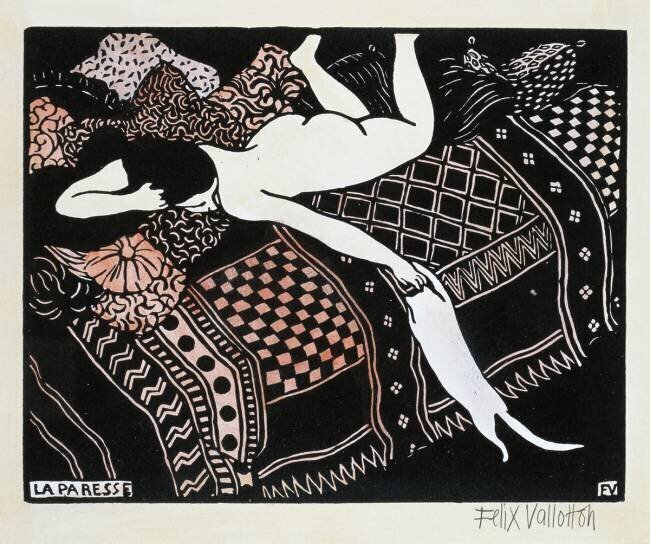 La Paresse est une estampe réalisée en 1896 par le peintre Félix Vallotton. A partir de 1890 et cela pendant dix ans, l'artiste peint peu et se consacre pleinement à la gravure du bois. Ses estampes apparaissent dans les revues et les journaux tels que Le Rire et Le Cri de Paris, lui procurant des revenus économiques confortables. Cette technique est pour lui un nouveau territoire d'expérimentation qui va lui permettre la mise en place d'un style plus personnel.