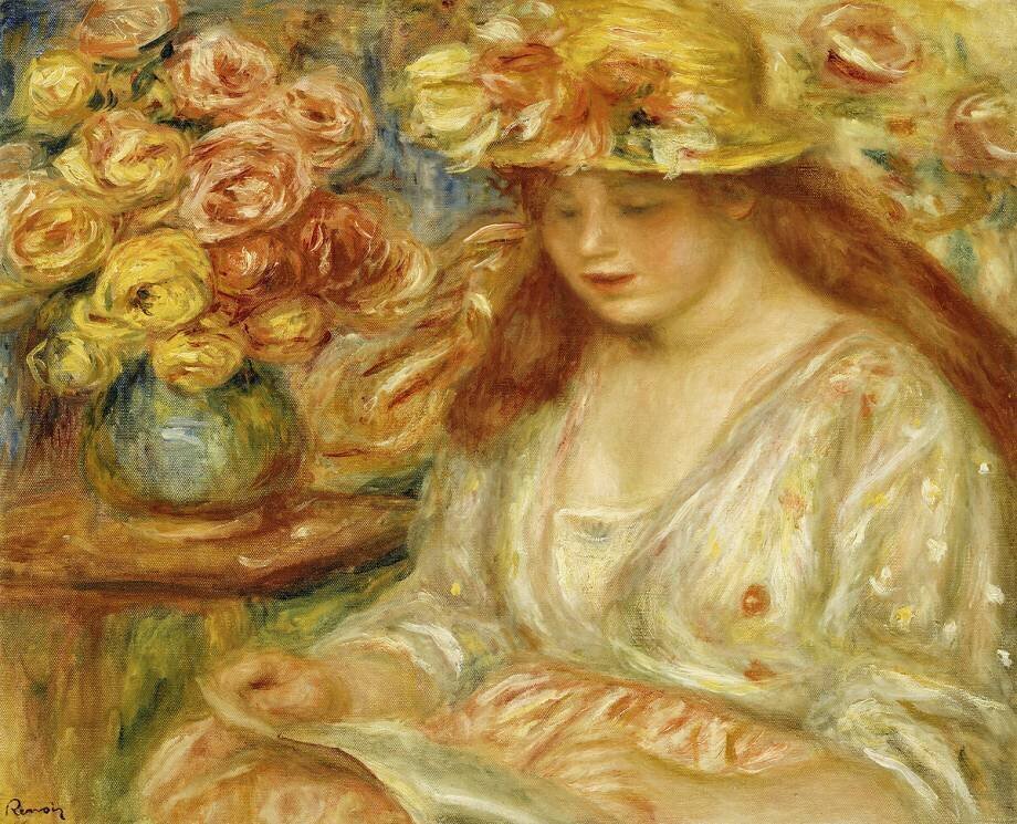 Mots-clés : Impressionnisme, peinture, portrait, assis, chapeau, fleur, lecture, livre, peinture, portrait, rosace orn, rose, rose