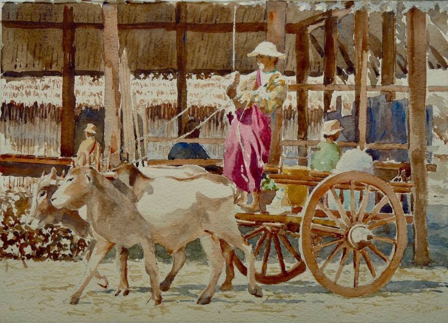 Mots-clés : Birmanie, peinture, bal, birmane, calèche, campagne, commerce, fiacre, Gens, marché, nature, pays, peinture, peuple, route, transport, verdure