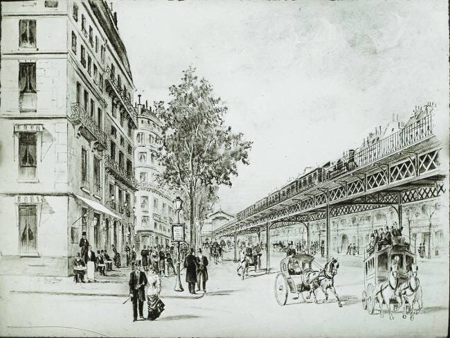 Mots-clés : La Belle époque, architecture métallique, métro, passant, piéton, rue, transport, ville, voiture à attelage