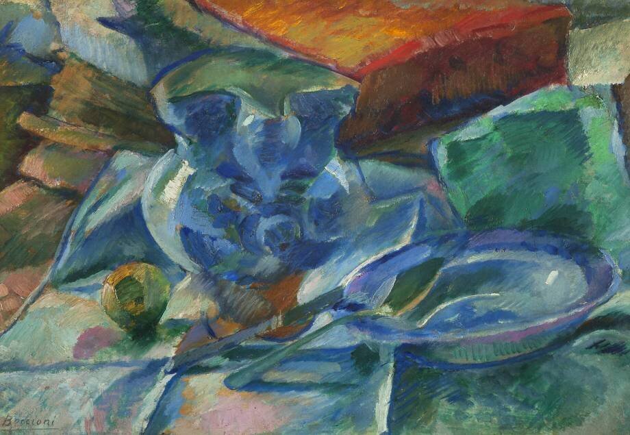Nature Morte de Faïence, Couverts et Fr... DE Umberto Boccioni