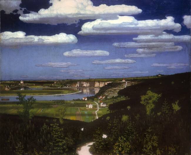 Mots-clés : 20e siècle, agriculture, champ, fleuve, nature, nuage, paysage, peinture, rivière, tableau, été