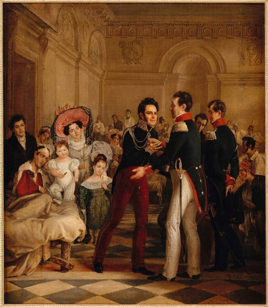 Le général La Fayette remet une médaille d'or au docteur François-Gabriel Guillon à l'ambulance installée dans le vestibule de la Bourse à Paris, en reconnaissance de ses services rendus pendant les journées de juillet 1830 - le 8 août 1830