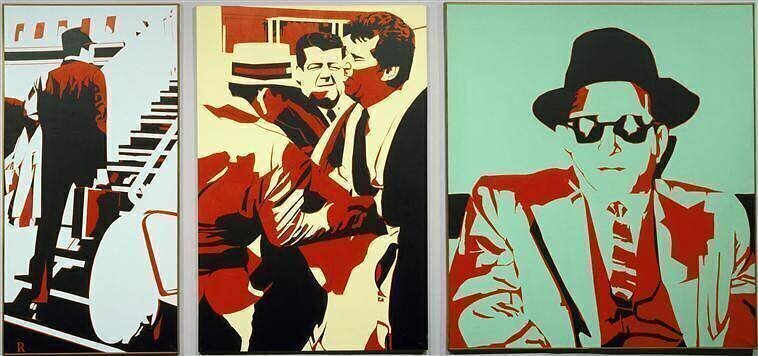 Les années 70, malgré un relent de parfum de culture hippie, furent une période agitée, prises entre la guerre du Vietnam et les luttes maoïstes. Il n’est pas étonnant alors si de nombreux artistes, à l’instar de Bernard Rancillac, choisirent la voie de l’engagement. Rancillac ne fut néanmoins pas un militant pur et dur. Certaines de ses œuvres se réfèrent bien à un contexte historique précis, comme la Palestine, mais d’autres comme Suite américaine, restituent plutôt un climat social plus général, et travaillent sur le stéréotype, le cliché. Ainsi ce triptyque hyperréaliste évoque une série de personnages, mi- malfrats mi- hommes politiques… L’éclairage est cru, violent comme peuvent l’être les flashs des appareils photos. La facture est on ne peut plus réaliste. Néanmoins les couleurs presque criardes appliquées par aplat donnent une grande étrangeté aux scènes, les teintes d’irréalité.