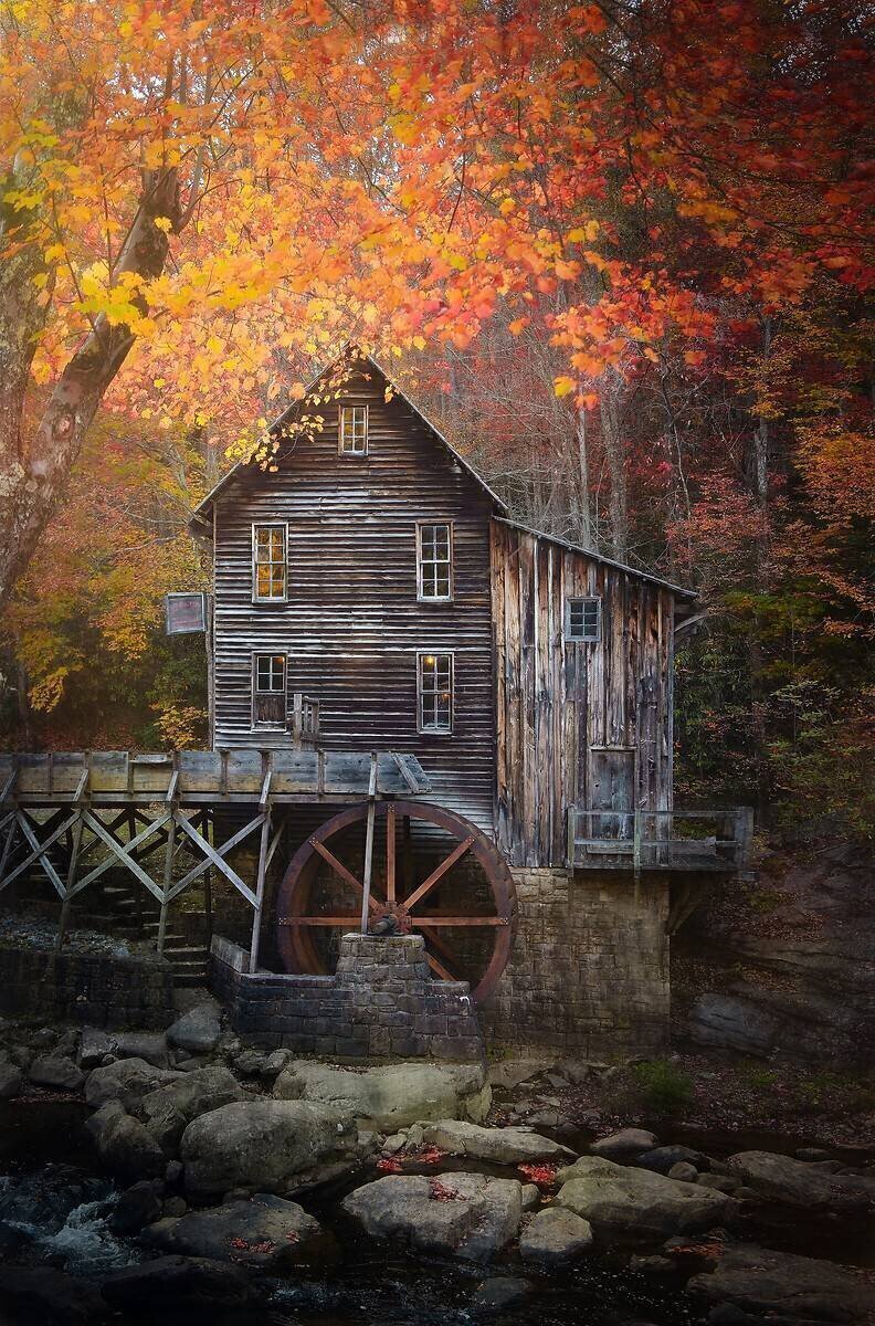 Mots-clés : automne, bâtiment, feuille, forêt, jaune, moulin à eau, orange, paysage, rivière, rocher, rouge